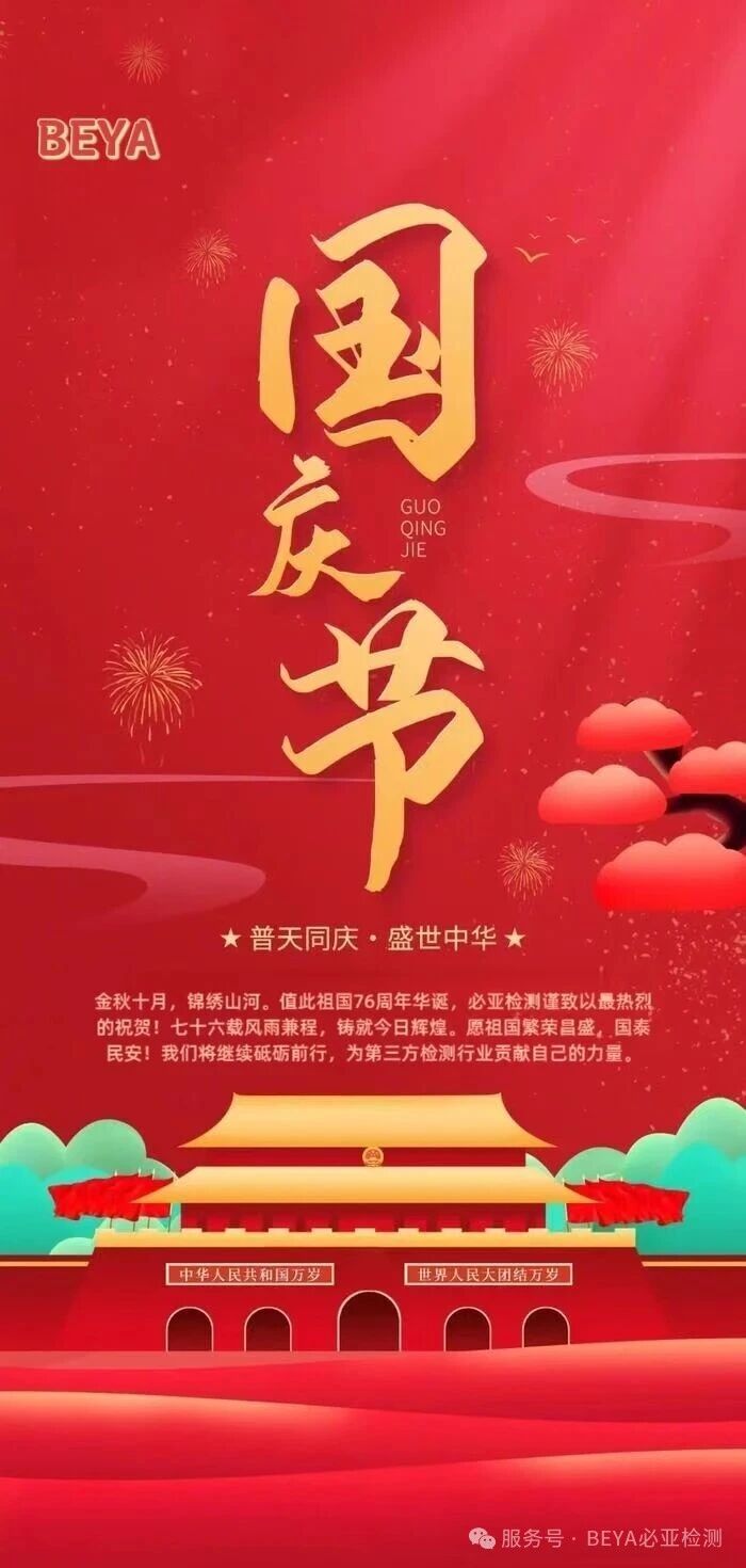 金秋十月,锦绣山河。值此祖国76周年华诞,必亚检测谨致以最热烈的祝贺!七十六载风雨兼程,铸就今日辉煌。愿祖国繁荣昌盛,国泰民安!我们将继续砥砺前行,为第三方检测行业贡献自己的力量。