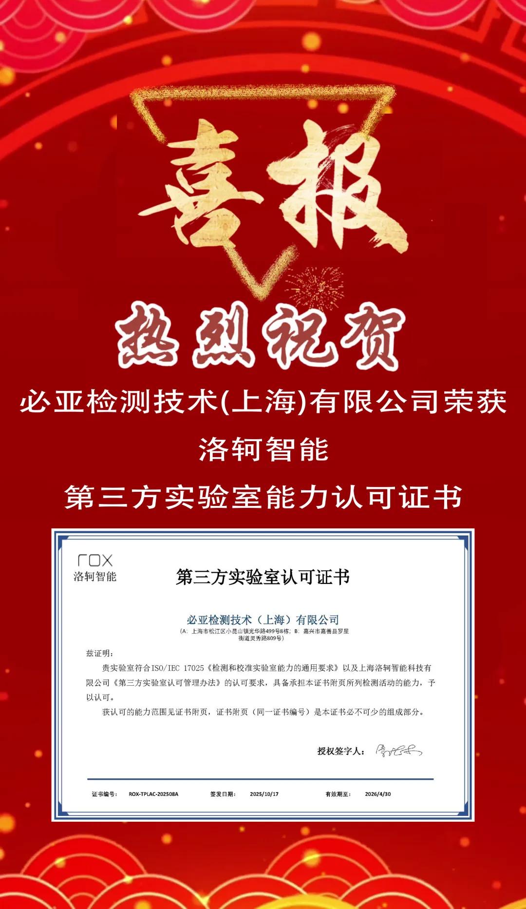 2025年10月17日,必亚检测技术(上海)有限公司迎来发展史上的重要里程碑——荣获洛轲智能第三方实验室权威认可。这不仅是对必亚检测技术能力水平的高度肯定,更标志着其在汽车检测领域的专业性迈入国际认可新层级。